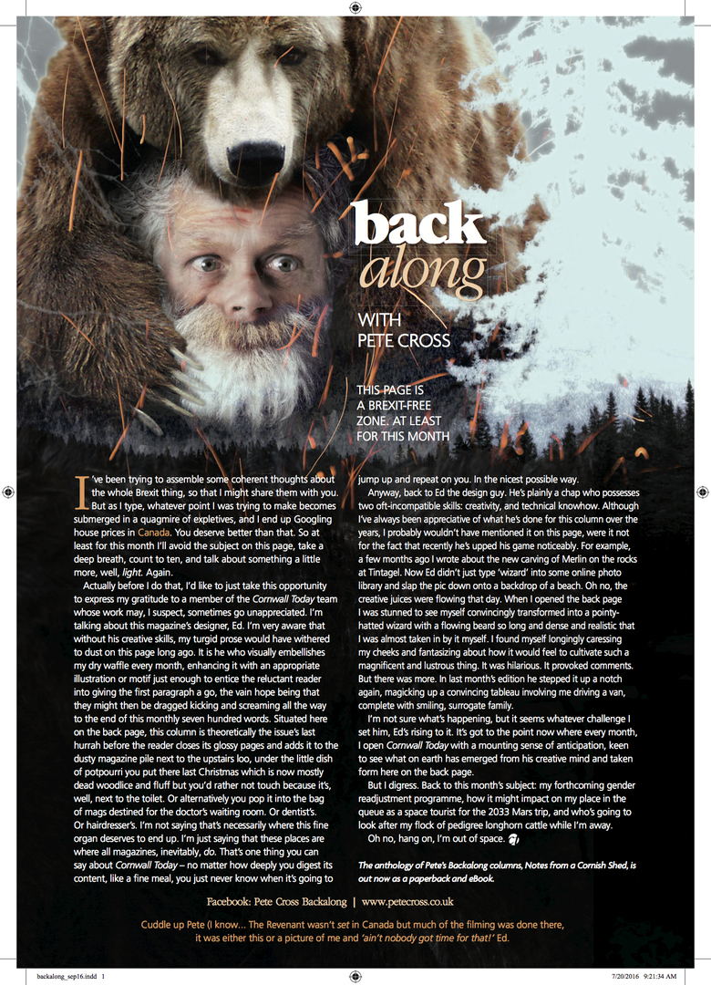 A selection of Backalong columns was published as the anthology Notes from a Cornish Shed in 2013, followed by a second volume, Another Shedload in 2017.